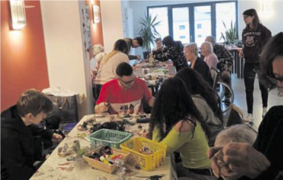 Zusammen mit ihren Betreuern machten sich acht Teilnehmer auf den Weg zum Seniorenheim, wo bereits einige Seniorinnen zusammen mit ihrer Betreuungsassistentin auf die jungen Besucher warteten. Nach einer kurzen Einweisung gingen alle Beteiligten in die Planungsphase über.