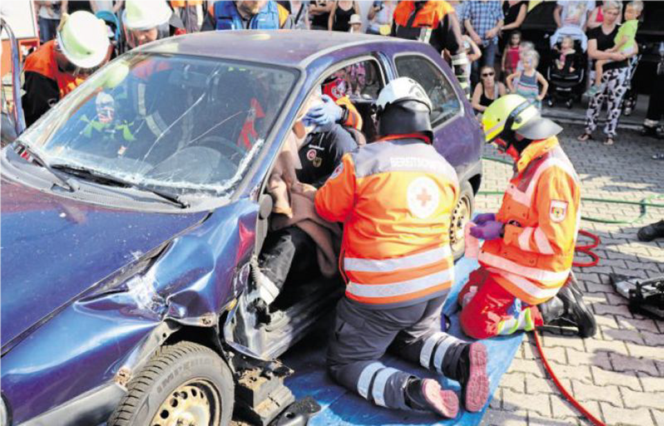 Für interessierte Besucher gab es einiges zu sehen, darunter eine Schauübung, bei der ein Verkehrsunfall mit einer eingeklemmten Person angenommen wurde. Außerdem wurde ein Feuer entfacht, bei dem es um das Löschen einer brennenden Person ging. Alle Vorführungen moderierte BRK-Bereitschaftsleiter Sven Lehner.