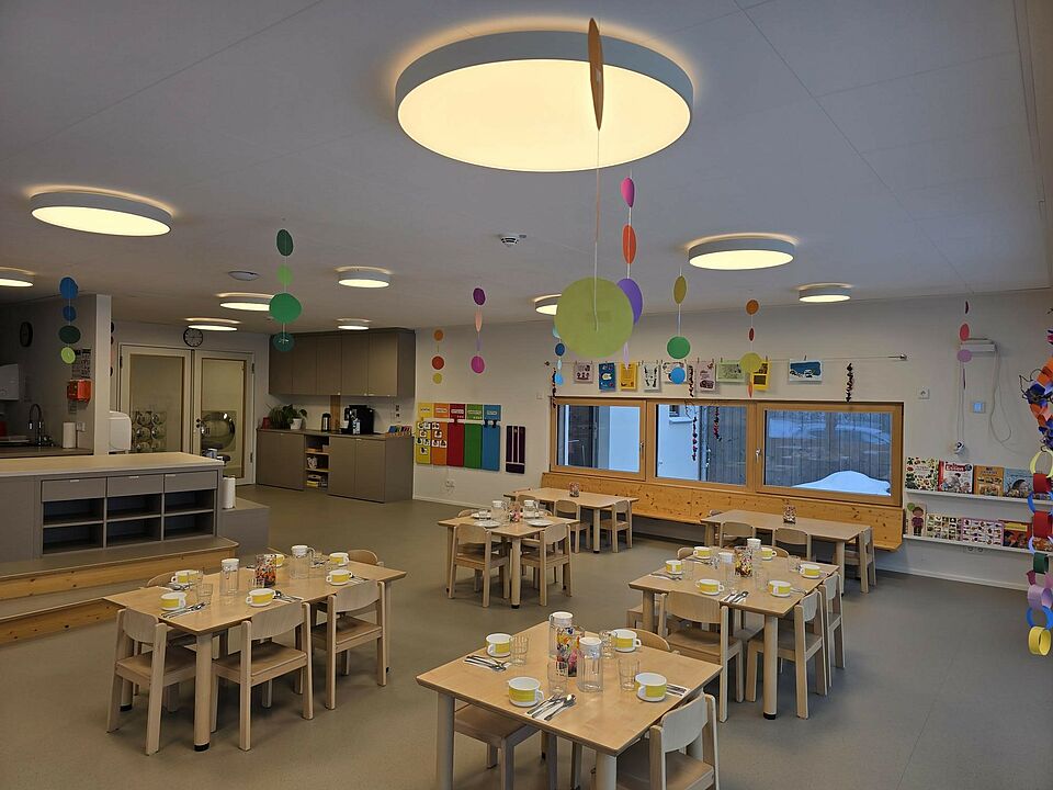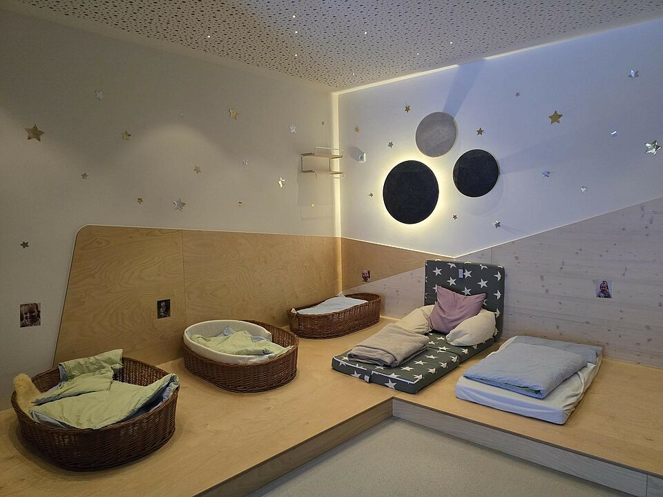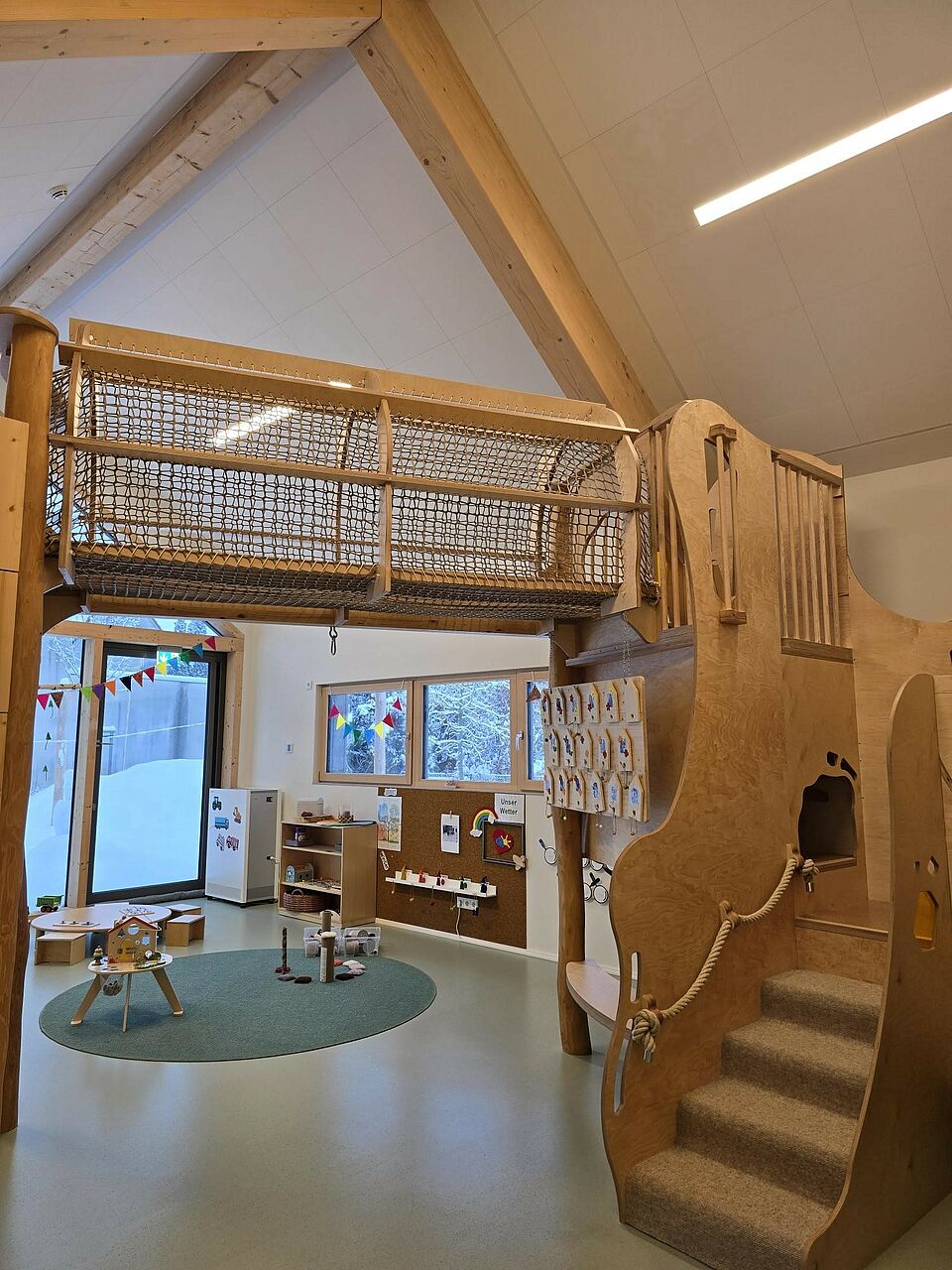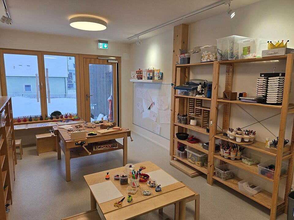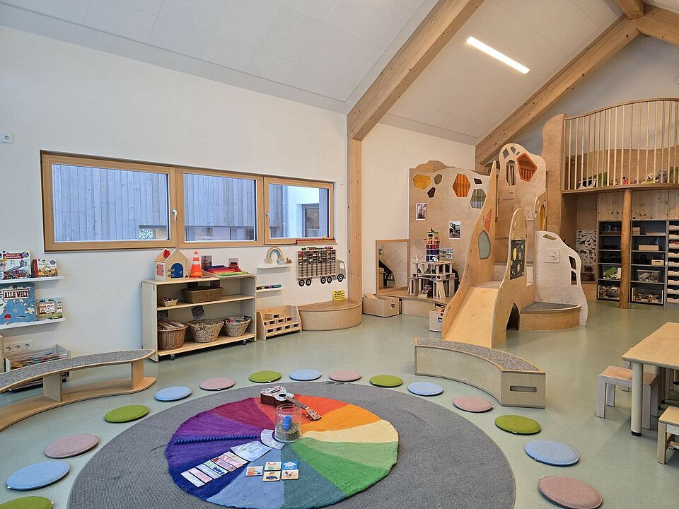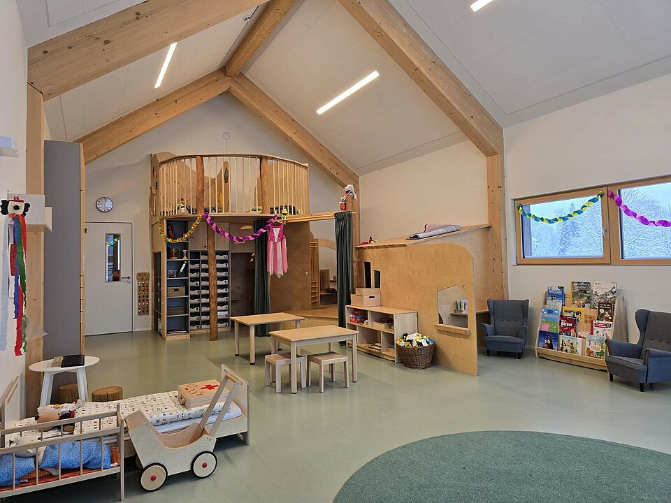 Somit wurde die Aufteilung der Räume nicht wie in konventionellen Einrichtungen in Gruppenraum und Nebenraum aufgeteilt, sondern die Räume nach Funktionsbereichen, wie z. B. Bauraum, Rollenspielraum, Atelier, usw. Im Eingangsbereich befindet sich unsere Piazza, die eine Verbindung zwischen Kinderkrippe, Kindergarten und Außenwelt herstellt und somit einen Begegnungsort für Alle schafft. Auch der Flur fungiert nicht nur als Verbindungsweg zwischen den Räumen, sondern wird als Spielflur intensiv genutzt. Durch die großen Fensterfronten im gesamten Gebäude wird zusätzlich eine Transparenz und Offenheit zwischen Raum, Material und Mensch hergestellt. Die Räume wurden gezielt so gestaltet, dass sie hell und freundlich sind und eine angenehme Atmosphäre schaffen. Dies wird durch viel Holz, einer zurückhaltenden Farbwahl, Fenster auf Augenhöhe der Kinder und verschiedene Lichtquellen erzielt. Besonders wurde darauf geachtet, dass die Räume flexibel nutzbar sind und sich an den Bedürfnissen und Interessen der Kinder orientieren. Die verschiedenen Einbauten in den Räumen ermöglichen viel Spielanreize, Bewegung, und eine Perspektivenwechsel durch eine zweite Ebene im Raum. Bewusst wurden bei der Raumgestaltung darauf geachtet, dass die Räume nicht mit Möbeln oder Spielzeug überfrachtet werden, sondern nur das gerade vorhanden ist, was den Forschergeist, die Entdeckungsfreude und die Abenteuerlust der Kinder anregt.