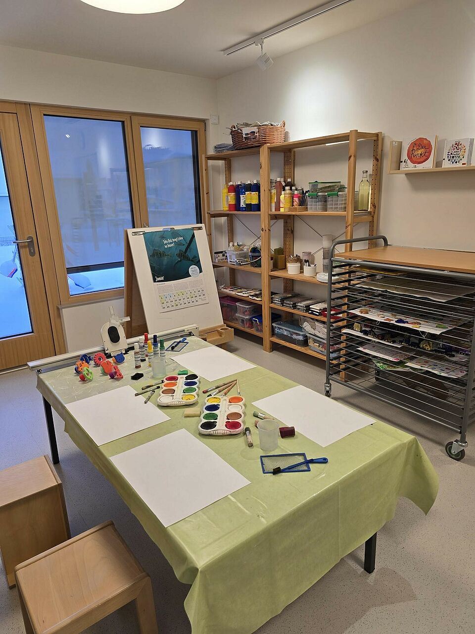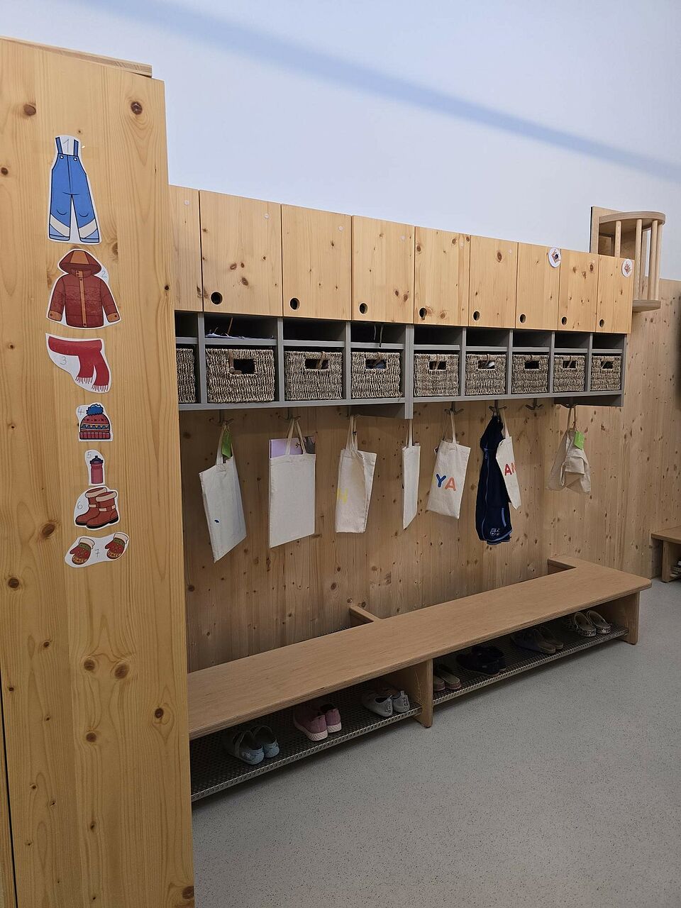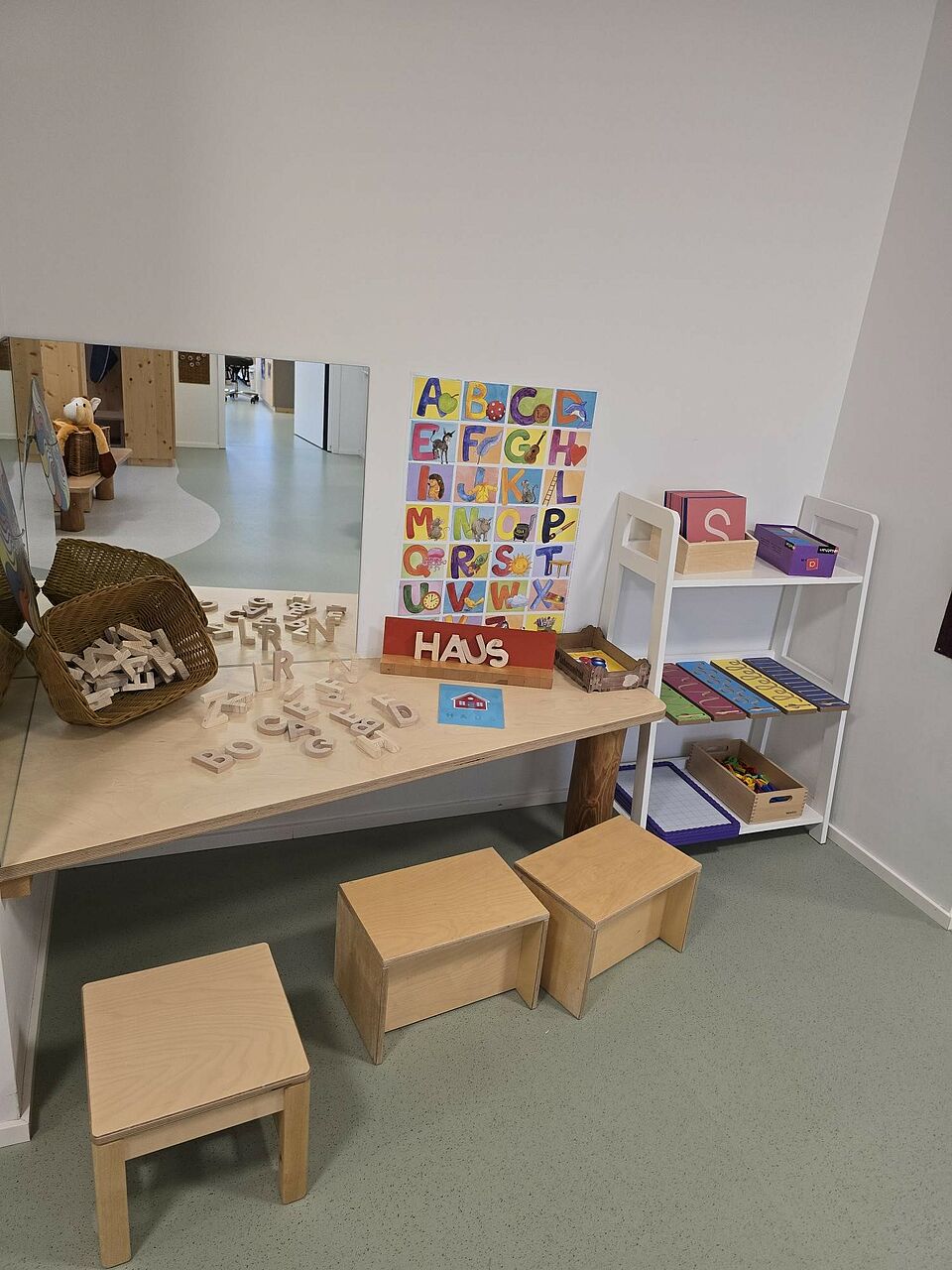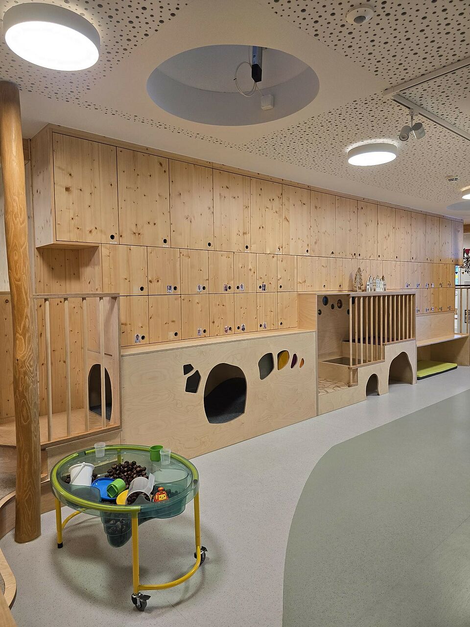 Somit wurde die Aufteilung der Räume nicht wie in konventionellen Einrichtungen in Gruppenraum und Nebenraum aufgeteilt, sondern die Räume nach Funktionsbereichen, wie z. B. Bauraum, Rollenspielraum, Atelier, usw. Im Eingangsbereich befindet sich unsere Piazza, die eine Verbindung zwischen Kinderkrippe, Kindergarten und Außenwelt herstellt und somit einen Begegnungsort für Alle schafft. Auch der Flur fungiert nicht nur als Verbindungsweg zwischen den Räumen, sondern wird als Spielflur intensiv genutzt. Durch die großen Fensterfronten im gesamten Gebäude wird zusätzlich eine Transparenz und Offenheit zwischen Raum, Material und Mensch hergestellt. Die Räume wurden gezielt so gestaltet, dass sie hell und freundlich sind und eine angenehme Atmosphäre schaffen. Dies wird durch viel Holz, einer zurückhaltenden Farbwahl, Fenster auf Augenhöhe der Kinder und verschiedene Lichtquellen erzielt. Besonders wurde darauf geachtet, dass die Räume flexibel nutzbar sind und sich an den Bedürfnissen und Interessen der Kinder orientieren. Die verschiedenen Einbauten in den Räumen ermöglichen viel Spielanreize, Bewegung, und eine Perspektivenwechsel durch eine zweite Ebene im Raum. Bewusst wurden bei der Raumgestaltung darauf geachtet, dass die Räume nicht mit Möbeln oder Spielzeug überfrachtet werden, sondern nur das gerade vorhanden ist, was den Forschergeist, die Entdeckungsfreude und die Abenteuerlust der Kinder anregt.