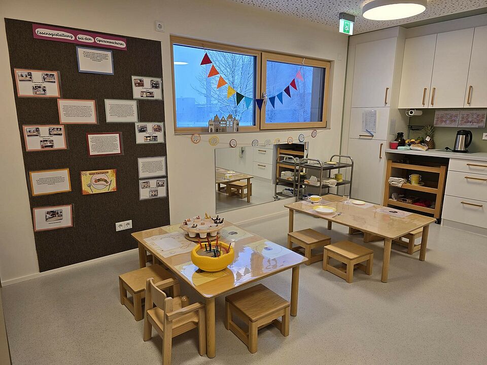 Die Kinderkrippenkinder erhalten ein gesundes Frühstück – bestehend aus Brot, Butter sowie regionalem und saisonalem Obst und Gemüse. An bestimmten Tagen wird das Frühstück von anderen Komponenten ergänzt, wie z. B. Milch, Müsli, Frischkäse oder Breze. Als Zwischenmahlzeiten gibt es Obst und Gemüse. Um die Kosten hierfür zu decken wird ein monatlicher Beitrag von 10 Euro berechnet, welcher gleichzeitig mit dem Krippenbetrag abgebucht wird.